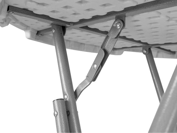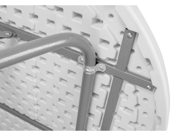 Galds salokās plakani ērtai transportēšanai un vietas taupīšanai. Drošības bloķētājs novērš nejaušu salocīšanu, bet gumijoti kāju uzgaļi aizsargā grīdu un novērš galda slīdēšanu.