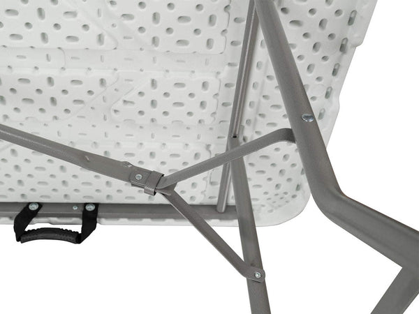 Neskatoties uz lielo izmēru, galds ātri salokās un tam ir speciāla roktura ērtai pārvietošanai. Eņģes bloķētājs novērš nejaušu salocīšanu, bet gumijoti kāju uzgaļi aizsargā grīdas no skrāpējumiem.