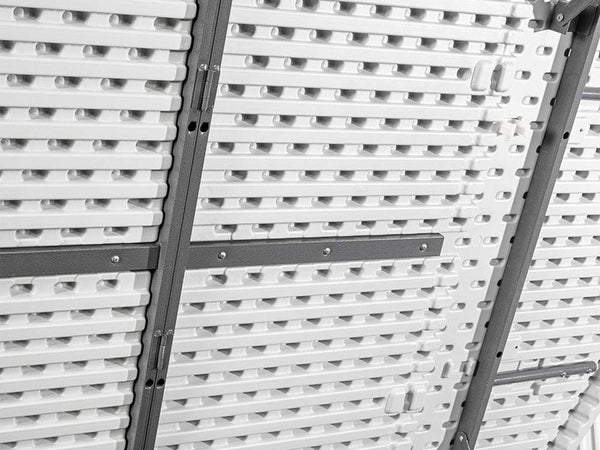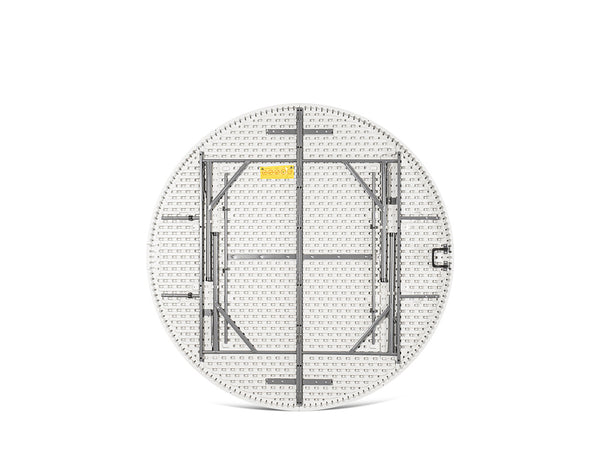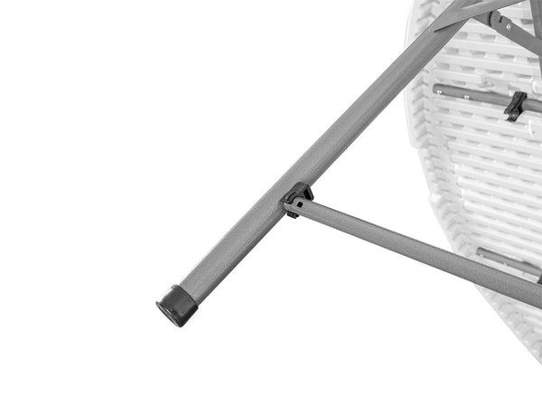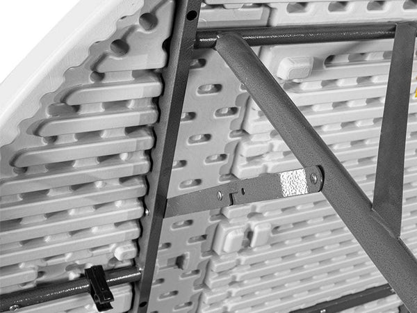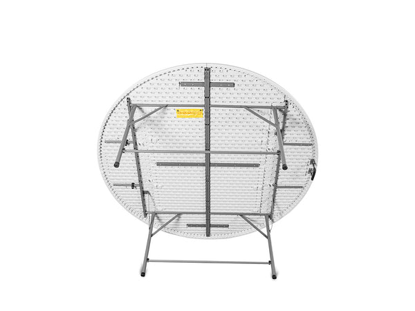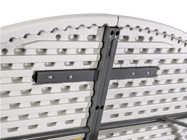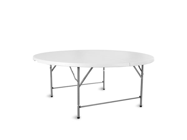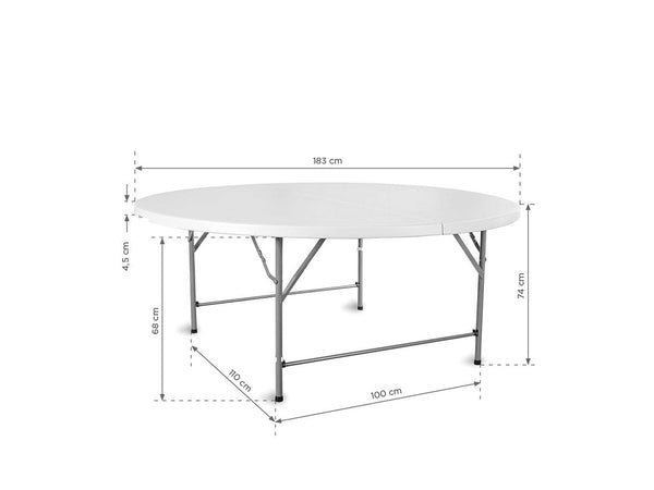 Funkcionāls un stabils apaļš galds ar izturīgu polietilēna virsmu (Ø 183 cm) un pulverkrāsotu tērauda rāmi. Galds ātri salokāms, ar eņģes bloķētāju nejaušas salocīšanas novēršanai. Gumijoti kāju uzgaļi aizsargā virsmas, rokturis nodrošina ērtu pārvietošanu.