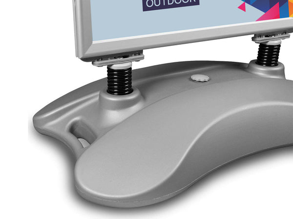 Ļoti populārs āra ietvju štenders ar atsperu savienojumu un ūdens balasta bāzi. Piepildīta bāze nodrošina lielu svaru un stabilitāti vējā, bet rokturis un riteņi atvieglo pārvietošanu. 32 mm snap rāmis ļauj nomainīt plakātu dažu sekunžu laikā. Bieza aizsargplēve ar UV filtru pasargā druku no saules un krāsu izbalēšanas.